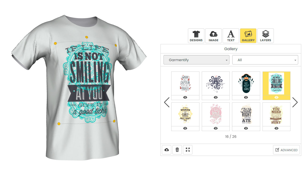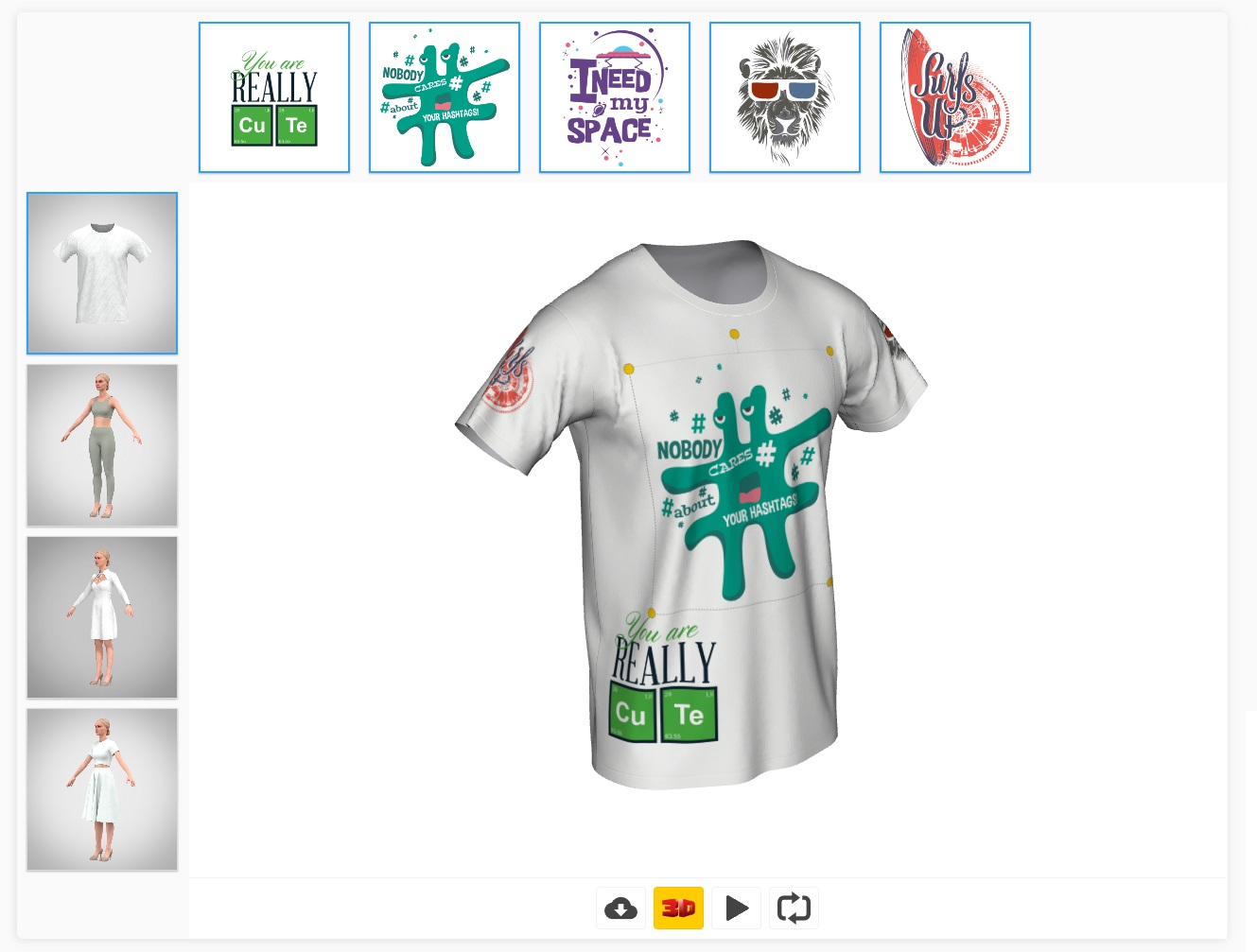- Previsualización de los diseños a escala sobre mockup de producto en 3D: el usuario puede posicionar los diseños sobre la prenda.