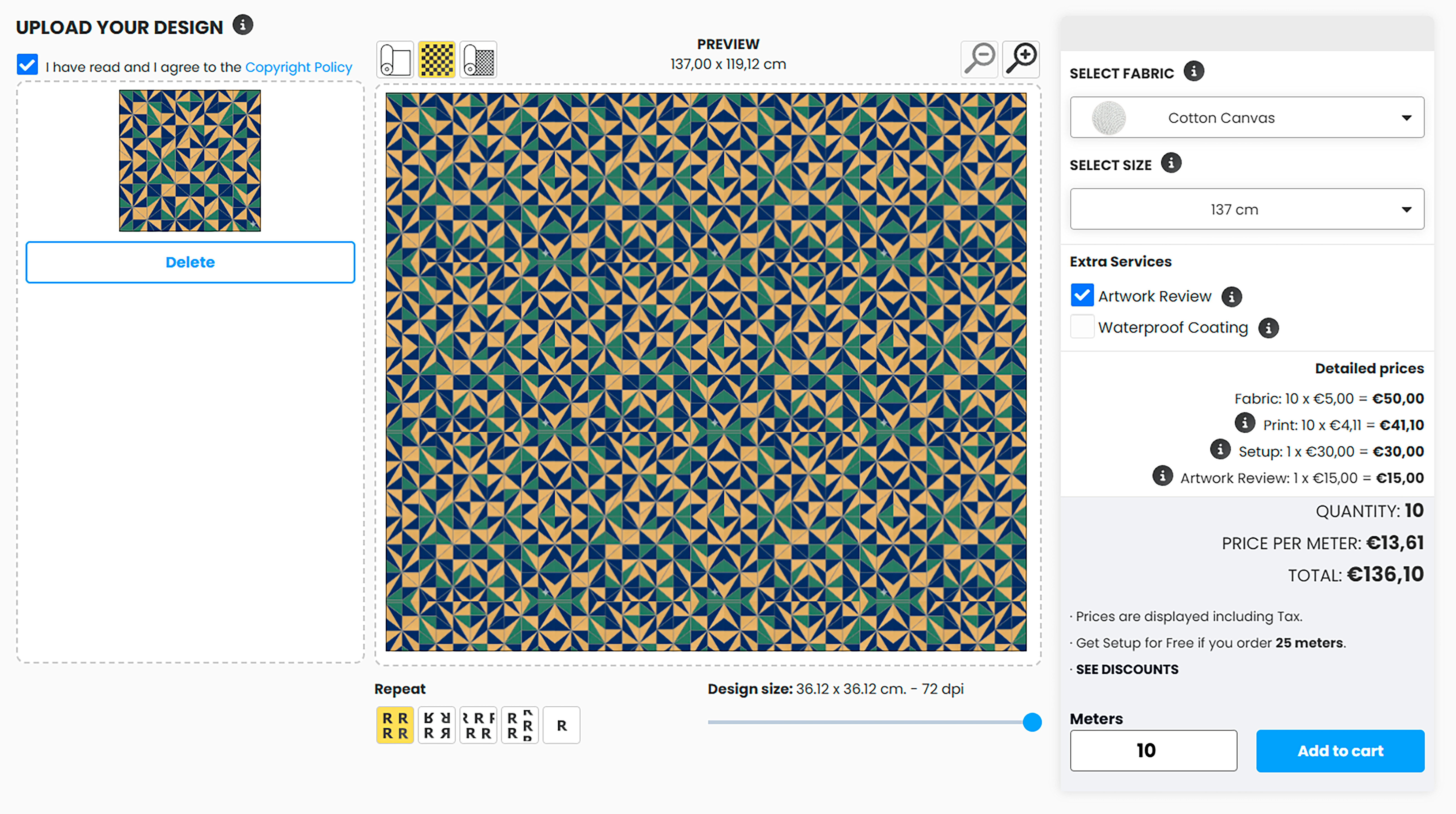 - Previsualización del diseño sobre el ancho de rollo y con la textura de la tela.